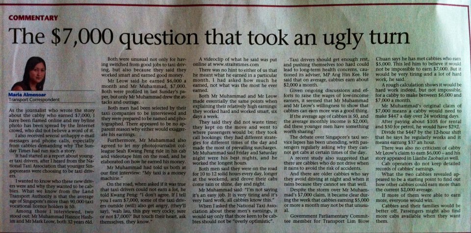 Neither the Straits Times nor the journalist who wrote the story is taking responsibility of the misleading untruths they had splashed all over town last week. The journalist hinted that the taxi driver may have lied.